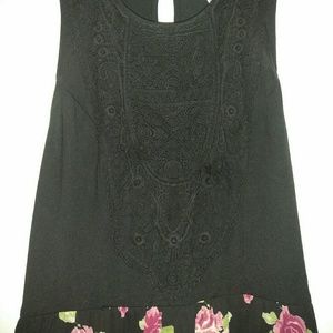 Floor length maxi dress in perfect condition. Only worn once. Gorgeous floral print with a black top. Top of the dress had small black lace details. Underneath is a black slip for a smooth finishing touch. The material is soft on the skin. Flowy, floor length dress.