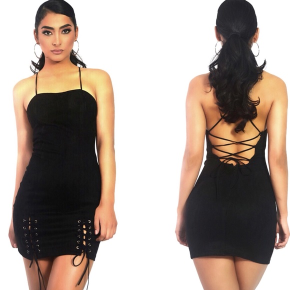 Suede mini dress with lace up in front and back. 100% polyester