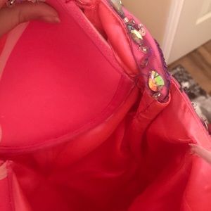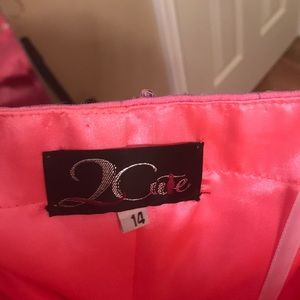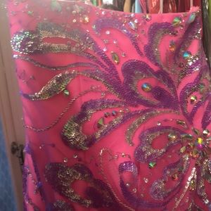 Prom/pageant dress. Originally a size 14 and had taken in to about a 10 or 12. Extra cups were put in. Can be easily let back out.