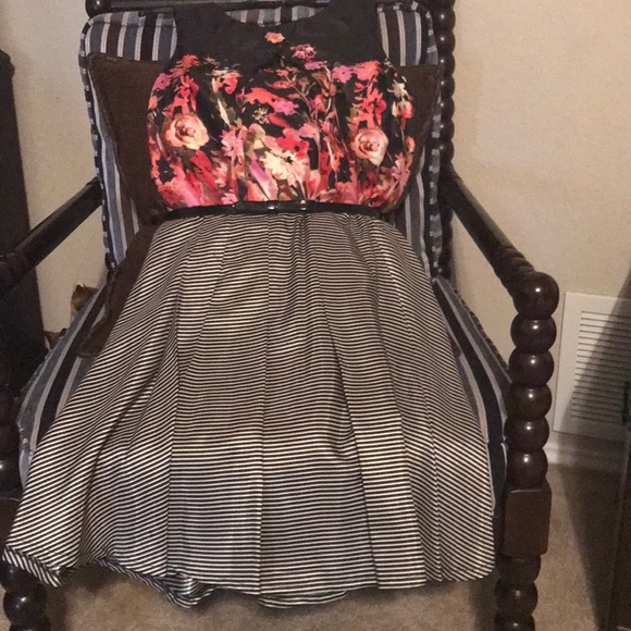 Short sleeve black and white pleated flair tail with floral bodice. Black bow belt.