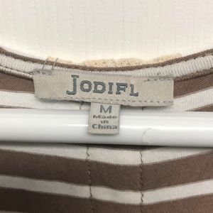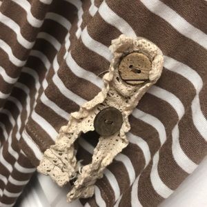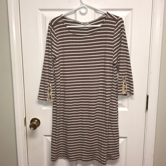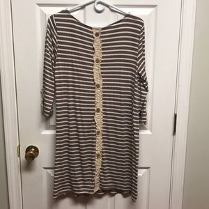 Brown short striped boutique dress with lace and button detail on back of dress and on sleeves size M