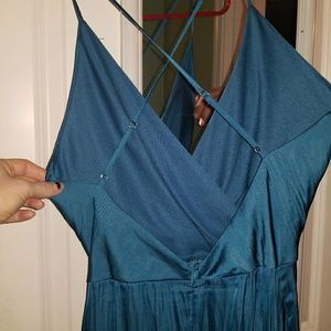 Sapphire blue dress. Spaghetti strap that crosses in the back. Bought it for a ball and didn't end up wearing it. Brand new. High low