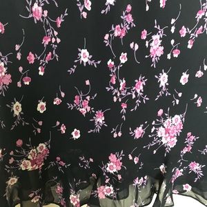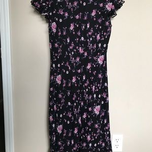 Mid length dress with ruffle detail along hemlines as well as flutter sleeves.