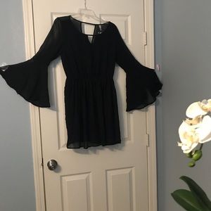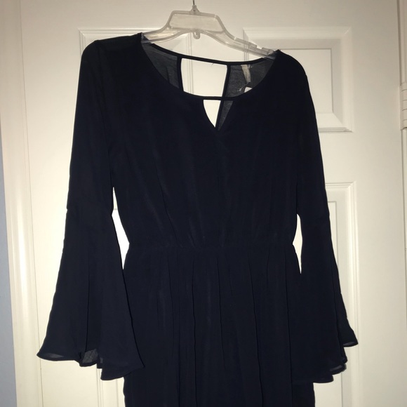 Navy short dress with elastic waist. It has an open back and it is lined, bell bottom sleeve, fits really cute