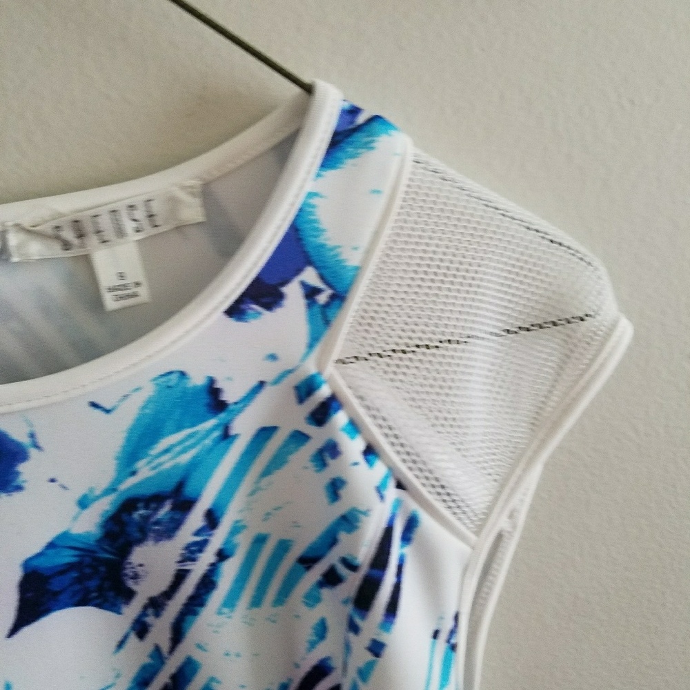 Light blue with dark blue and white jas soke mesh on top of the shoulder knee length pencil dress type in great condition!