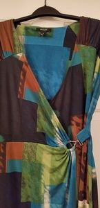 Multi color, short sleeve, waist synched dress. Poly/spandex. Smoke/pet free home. No flaws. EUC! 30 inches from armpit to hem. Flattering!
