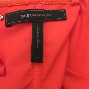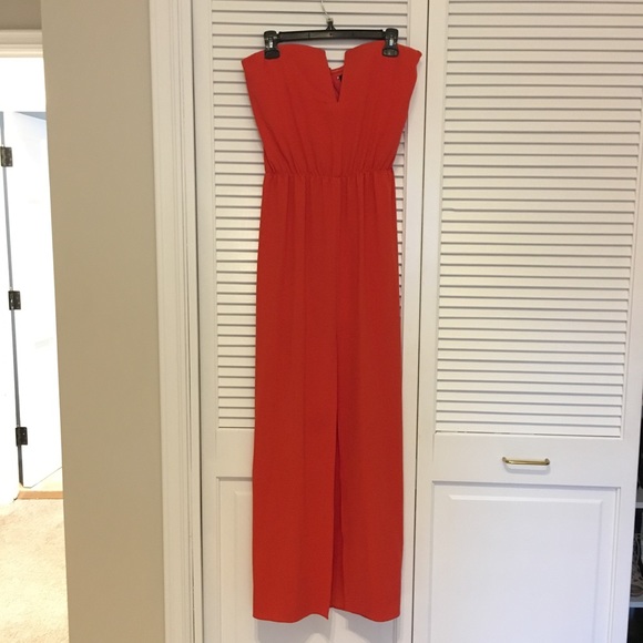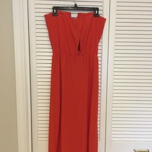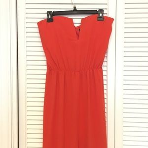 Strapless chiffon dress with a V neckline. Dress is lined and in good condition. Bright tangerine or coral color.