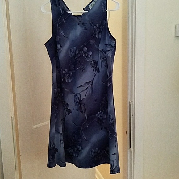 Sleeveless with black and blue flowers. Tag says 13/14 size but dits more like a 10. 37" from shoulder to bottom and 19" from pit to pit.