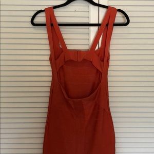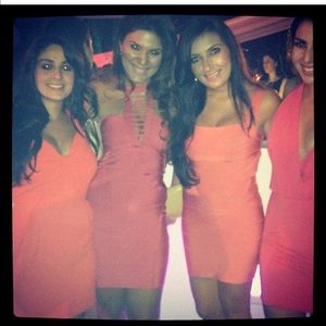 Coral bondage cocktail dress with open back. In good condition -and hits just above the knees.
