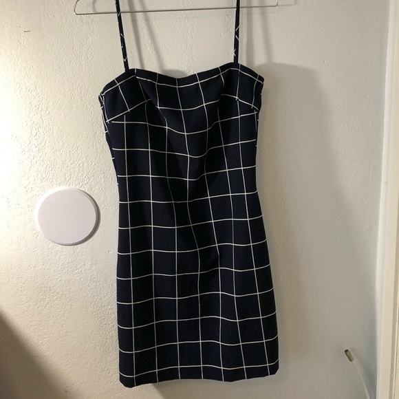 Navy blue dress with vertical and horizontal white lines. Super cute for a night out. Only worn once