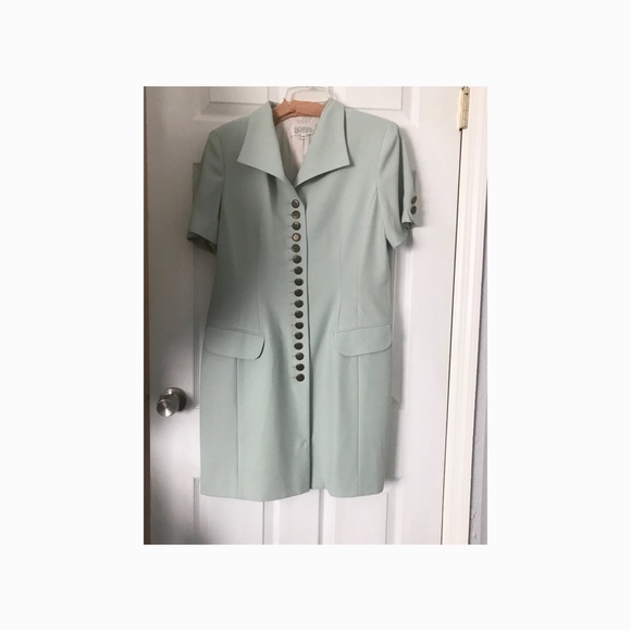 Awesome button detail on front and sleeves. Sage green. Lined. Pockets but I never opened them. Worn once.