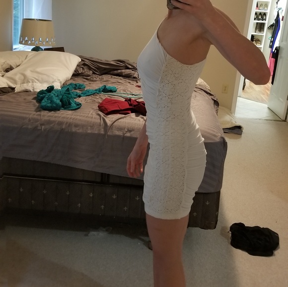 One shoulder white dress with crochet flower detail down one side and zipper on other side. Worn once and in impeccable condition.