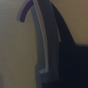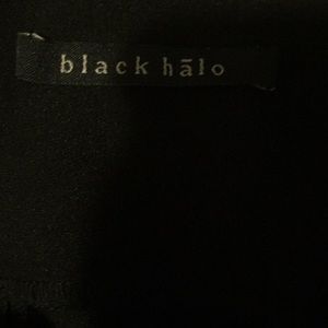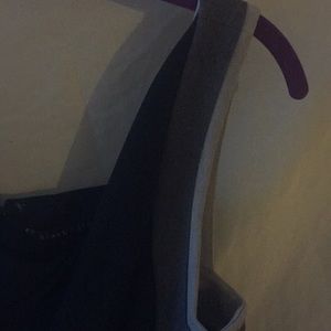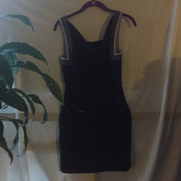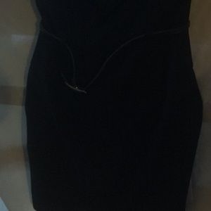 Sleeveless black dress and belt dress has semi cowl neck of the sleeve area black and grey. Dress is right above the knee