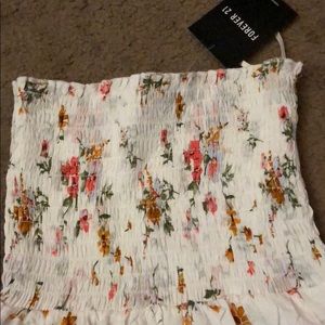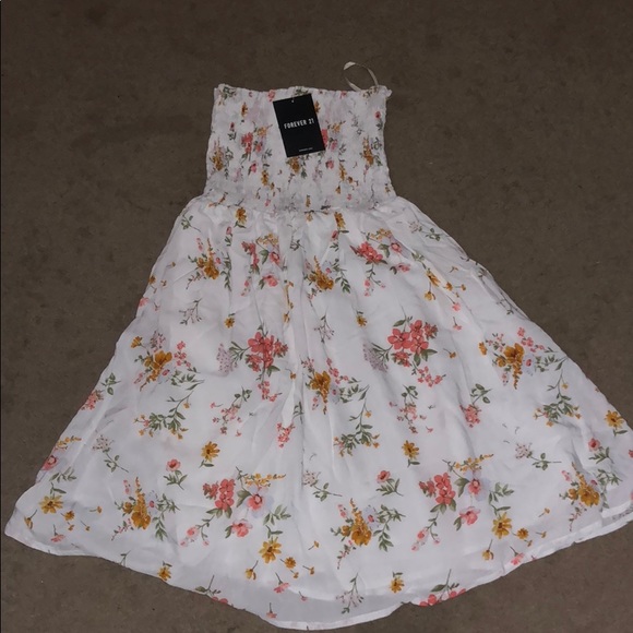 This is a super cute all white strapless with floral print flowy dress. Perfect for spring and summer! The top part is stretchy material