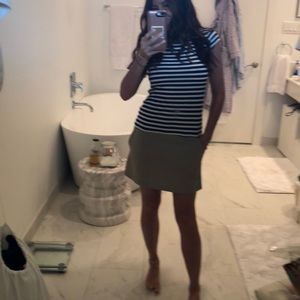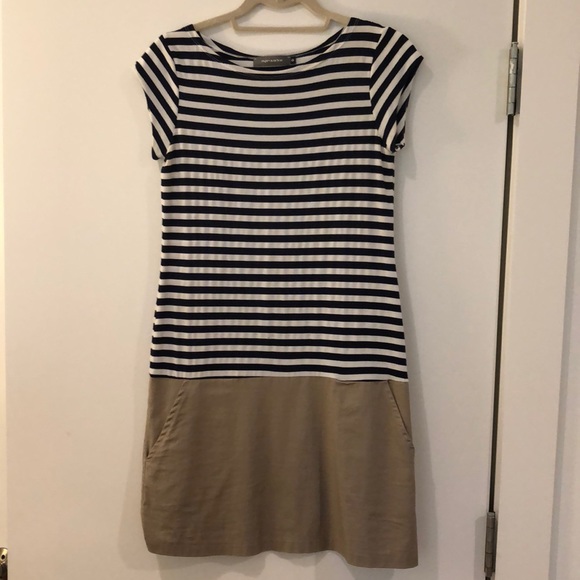 Chic mini dress, navy/white stripe. Beigeon bottom with two pockets