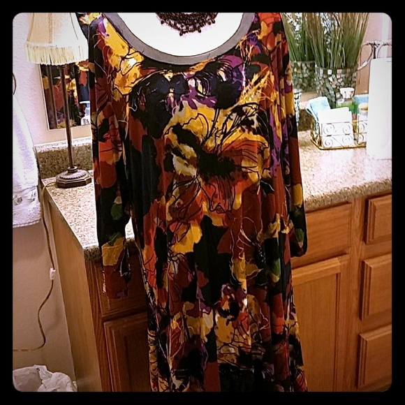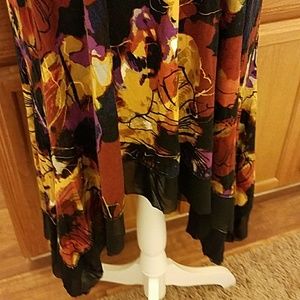 Womens knit dress, handkerchief hem. Multicolor purple, gold, rust, on black knit
