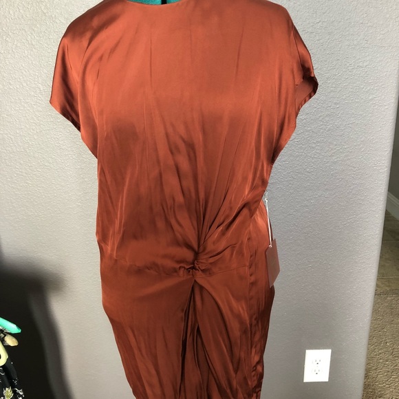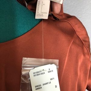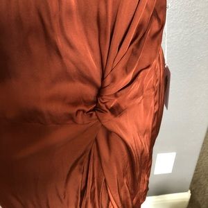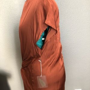 It’s wrinkled a bit but it’s cute. Tie front dress dolman sleeve, sits a bit above the knee if your 5’7. Zips in the back. Soft rayon, poly blend. Rust/amber color.