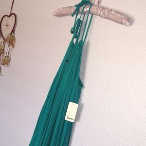 Teal double halter top dress with high-low lace hem. Fits to form. Size S.