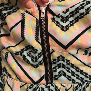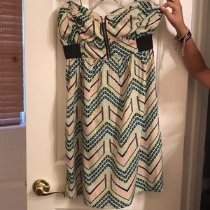 Cute summer dress. The black rib/waist area of the dress is elastic. A mix of mint green, light pink, and some yellow. Dress is above the knee.