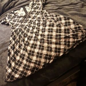 Black white and red checkered. Flares out at bottom. Lace tie in the front