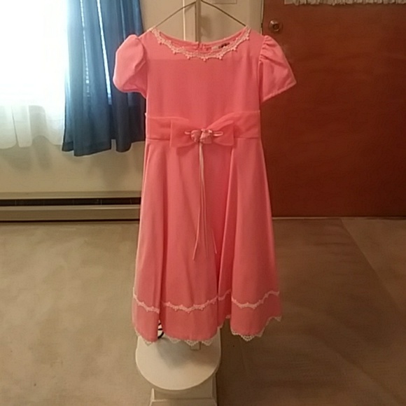 Its a pink and white lace dress with a bow in the front