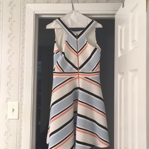 Sleeveless dress with coral, white, black, and light blue stripes.