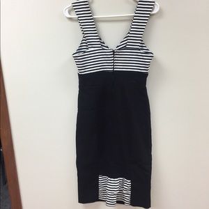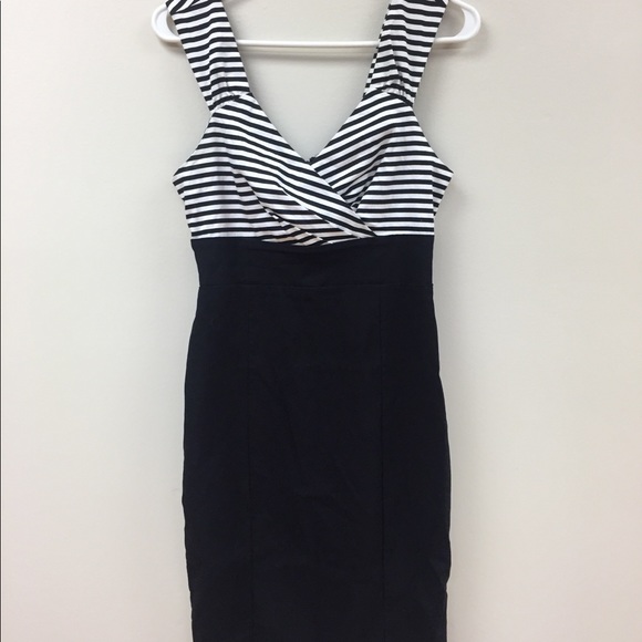 Business-like dress. Black and white stripe on the top, form fitting. Loved this dress but didn’t fit for very long, I only wore it one time! Size Medium