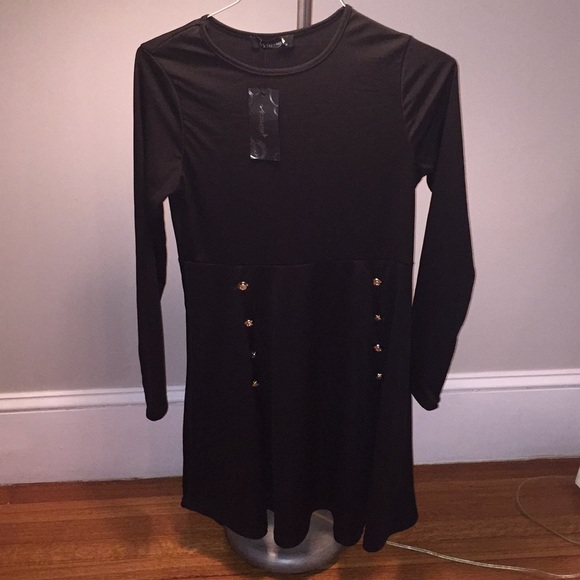******Brand New with Tags*****Black long sleeve spandex dress with gold buttons along the front, fits to perfection. It wears great with leggings or pantyhose underneath!