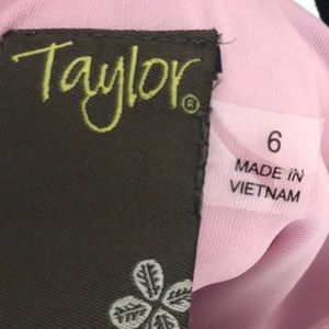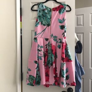 Bubble-gum pink with floral design on it. Worn once, bought from Dillard’s. Pockets and has a gold zipper in the back.