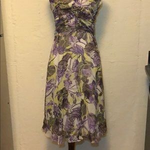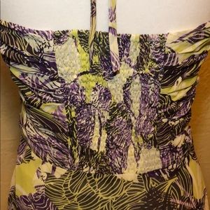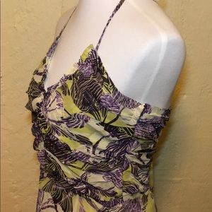 Halter style with neck ties, ruched front with hint of ruffles in front, elasticized back with hidden side zipper.