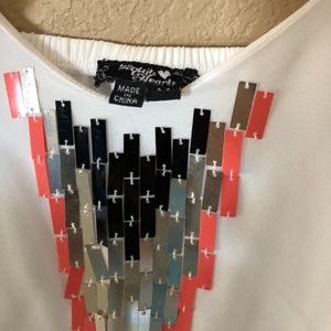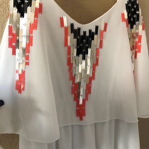 Short white dress with multi color design on the front. Worn once, no stains or anything. Perfect for any outside gathering, party, graduation, ect.