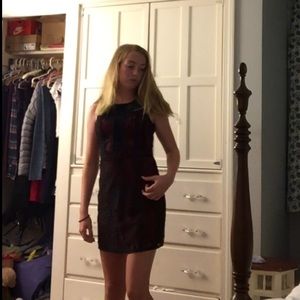 Black and red laced, no sleeves, falls above the knees, and closed back and front.