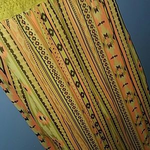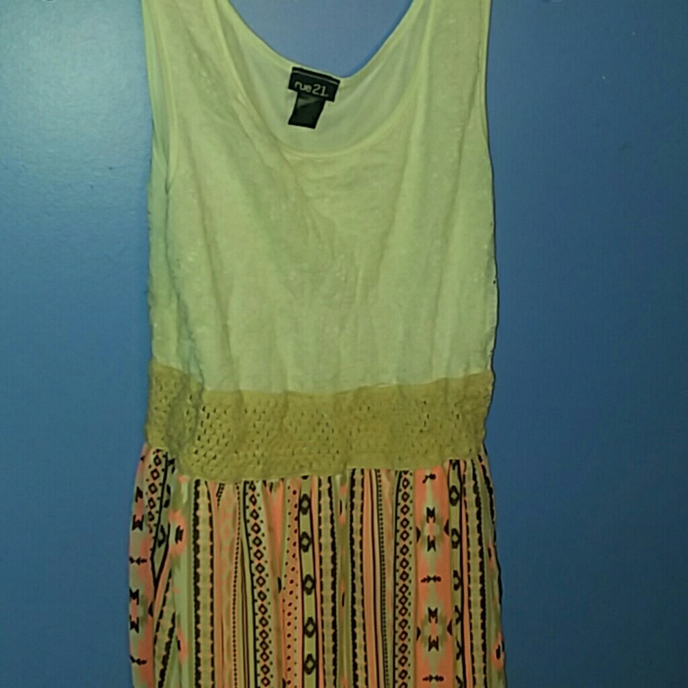 A dress with white at the top, tan around the waist and pink, tan, dark brown and white design's down the bottom.