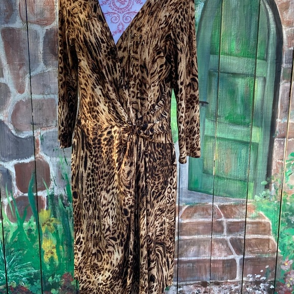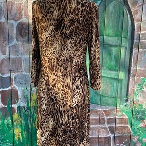 Animal print with metallic gold accent in pattern, wrap dress. Knit, washable