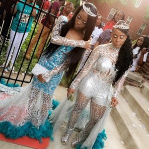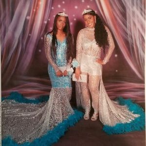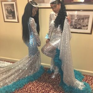 Turquoise inner dress, and turquoise feathers on the tail. Dancing dolls material, glitter and black out.