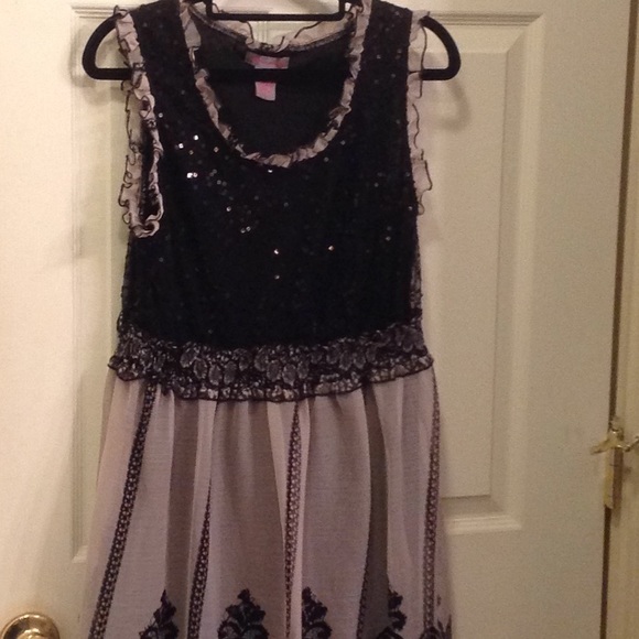 Black sequined top and grey and.black bottom.its a very unique and versatile dress