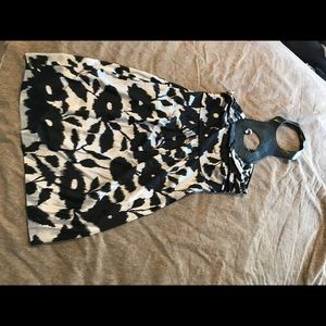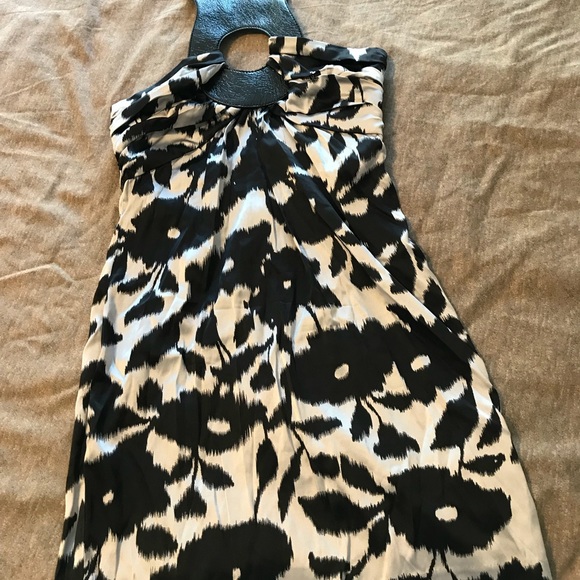 Leather encircled over breast area & snaps around back of neck....colors: black & white...zipper on side...soft silky fabric...14” pit to pit...30” long
