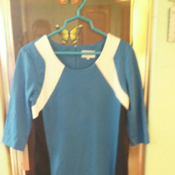 Beautiful blue, white and black dress. Worn gently. Tags show size 34 (Size 4 in US). Can easily fit a size 6. Black material on both sides going vertically.