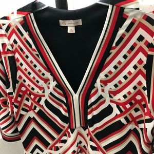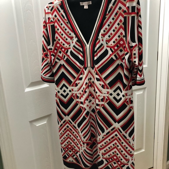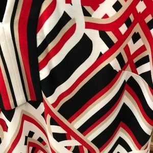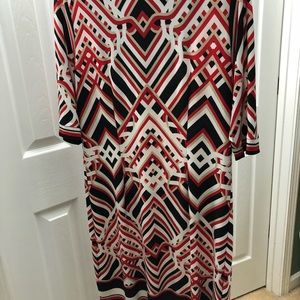 Excellent condition dress has spandex for flexible fit. Red white black and tan design. Three-quarter length sleeve
