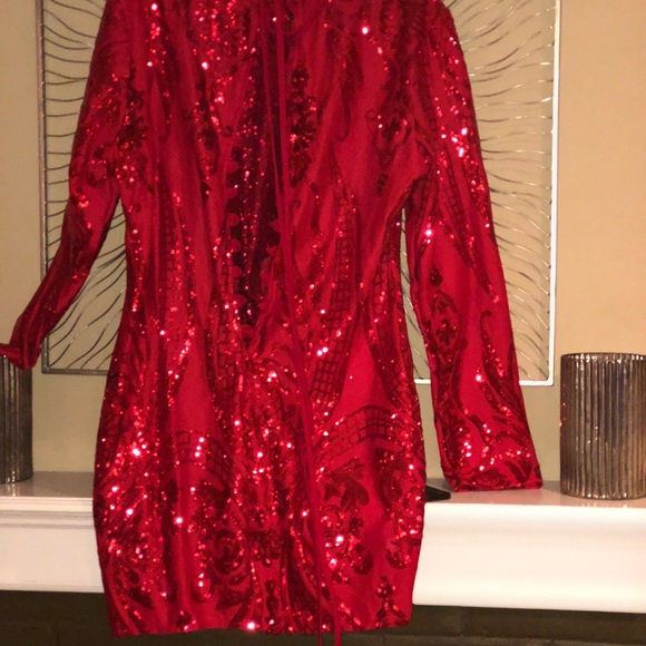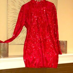 Sequence red dress that would be great for a cocktail party. The back has a corset closure that you lace and tie up going toward the bottom. It’s above the knee in length . I dare you to be bold and rock this piece