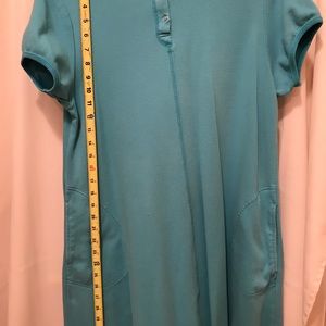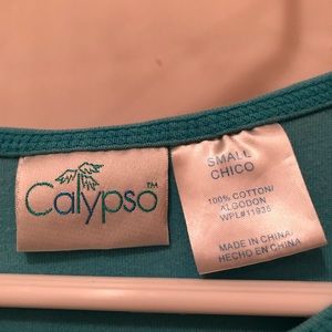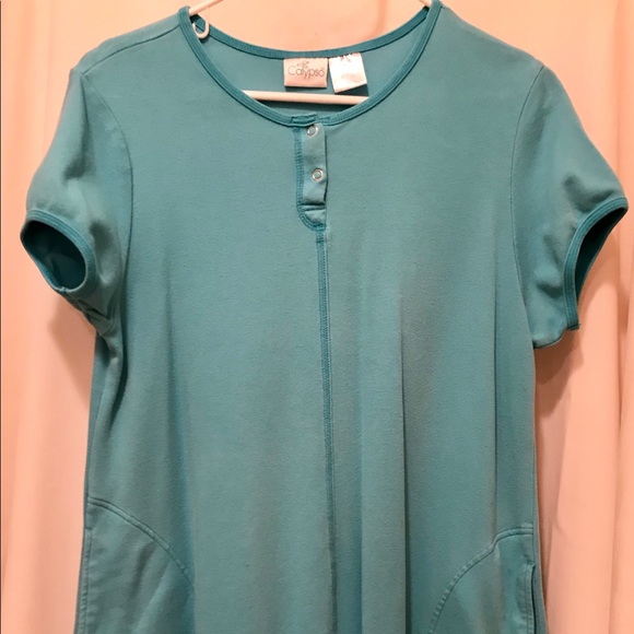 Calypso 100% cotton casual dress. Pockets on each side and top stitching around the neckline, sleeves, pockets and hemline.