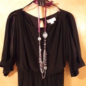 Black, sleeves slit, silky dress with Papparazzi unused necklace and earrings.