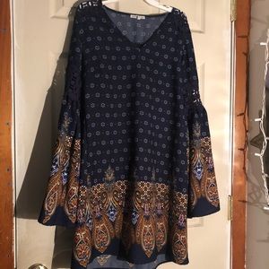 Belle sleeve tribal print dress. Not stretchy. Cute and comfortable. Worn a few times, great condition. Offers accepted! Fits like medium. Thigh length (I am 5’8)