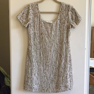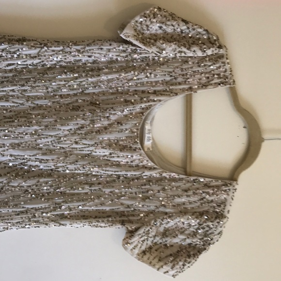 Debi debo pink sequin with multi colored threaded beads( olive, pink, clear) worn once for special event. Fully lined.. base color of dress is a light tannish cream color. Hemline Has been altered professionally. Could fit small size.. bust measurement is 18 in with loose waist