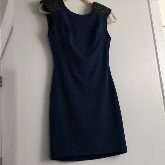 Mid length blue dress with black leather shoulder pads ( not thick)