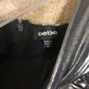 Metallic silver or dark grey dress. Strapless with zipper in the back