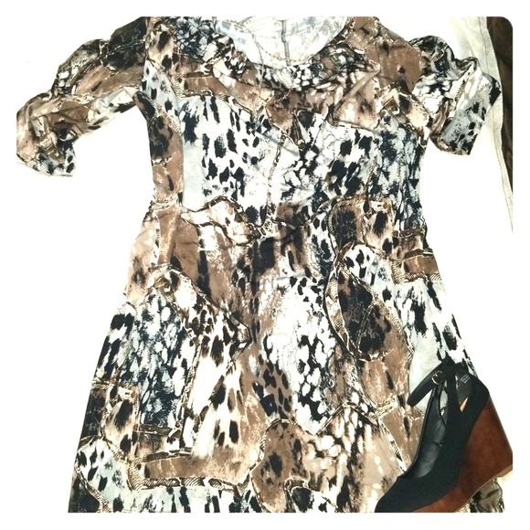 Beautiful chic abstract animal dress length of dress from shoulder to bottom is 40 inches. Quarter sleeves. Comfortable and great stretch