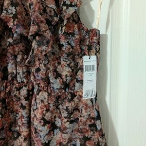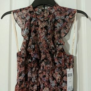 Brand new. Fit true to size. High neck, ruffles in the front.