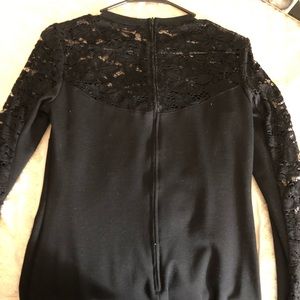 Long Form fitting dress. Lace detail runs along the neck and chest area, down the shoulders and both arms. Zipper runs down the back. Very conservative and classy look. Material is thick and stretchy. Length runs just under the knees. Worn once.