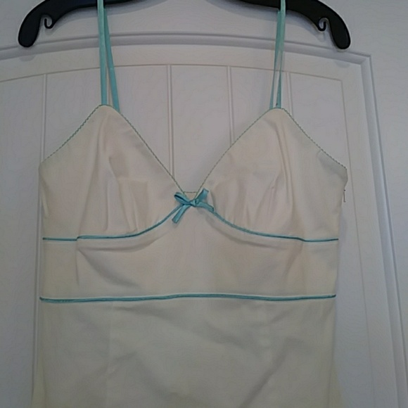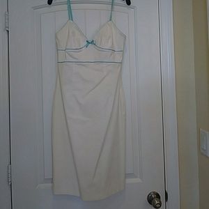Beautiful white linen material with baby blue trimmings. Dressed has interior lining. Spaghetti strap. Super sexy!